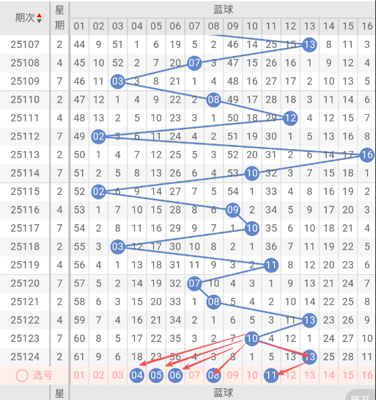 根据走势图近10期的走势看,蓝球在107期开出13蓝球之后,3小1大1小2大1小2大1小1大2小3大,再看下近10期的蓝球热码有回补的趋势,这种趋势规律本期判断极有可能开出小号,本期防蓝球12大号,蓝球本期重点关注04,05,06,08,11