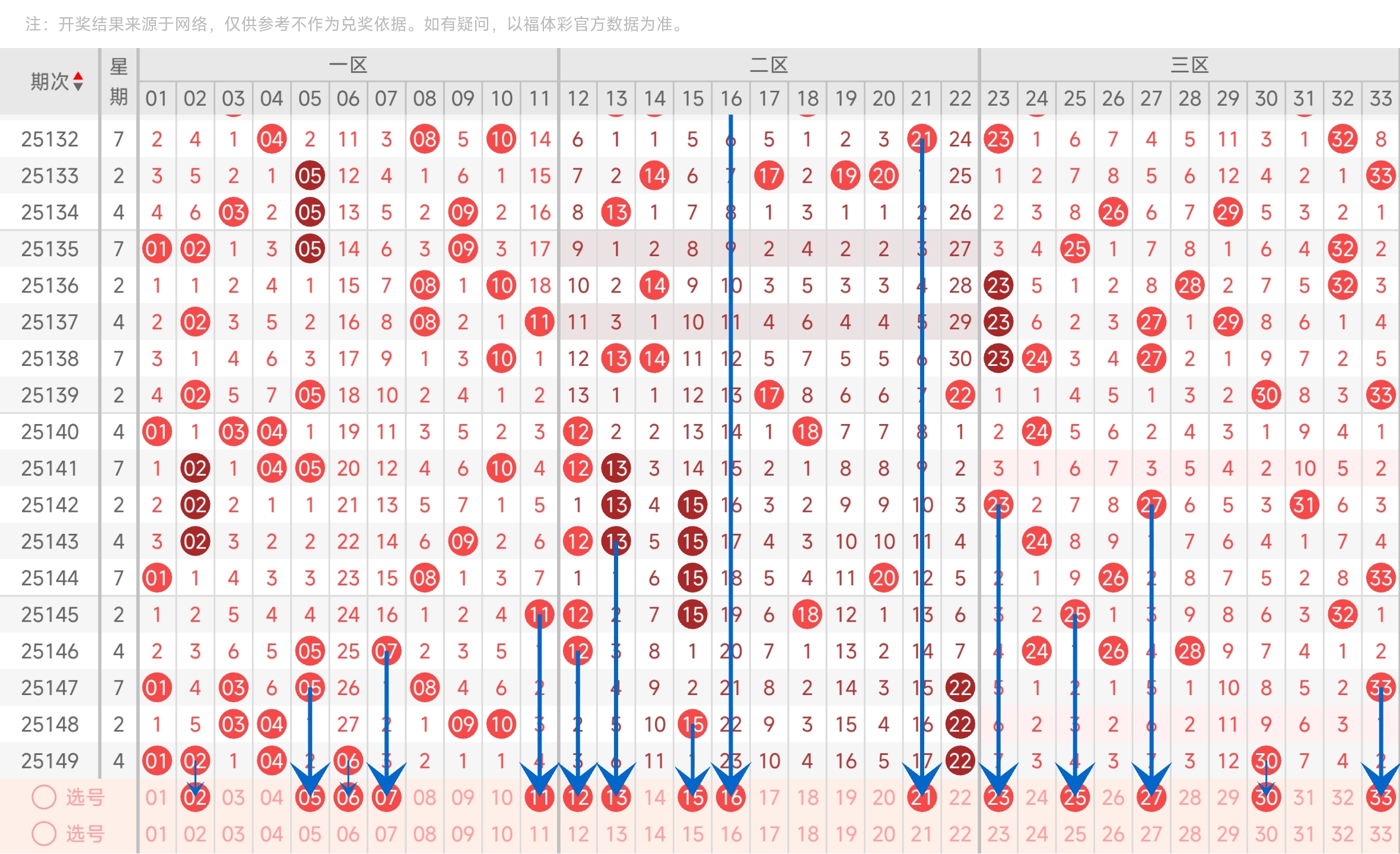 上一期三区开出了30号球。往前一期没有开出号码。通过走势图分析,可以看到上期开出了1码,开在了右边,本期凤尾还是比较看好右边,其次是开左边的。再从最近开号位置来看,比较均匀,所以本期我们均匀关注一下号码。最后再结合冷热号和遗漏期数,本期我们可以关注23,25,27,30,33等号。综上所述本期我们推测有可能开出23,25,27,30,33等号码。