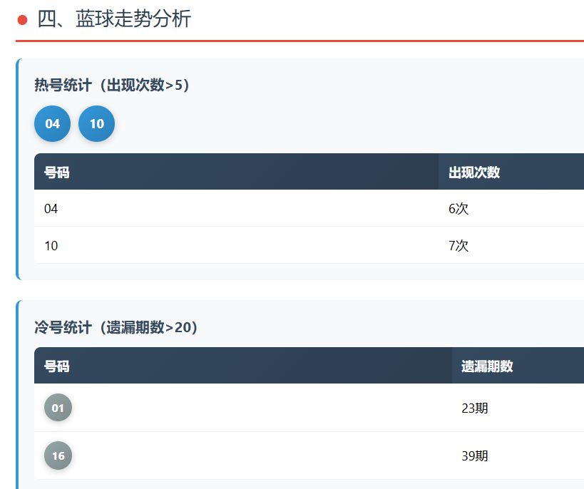 蓝球这边节奏更直接一些。04和10是当前最活跃的两个点,其中10刚刚开出,热度还在延续。相比之下,01和16则属于明显冷区,尤其是16,已经长时间没有回补,这种极端冷号短期内反而不太容易成为焦点。
