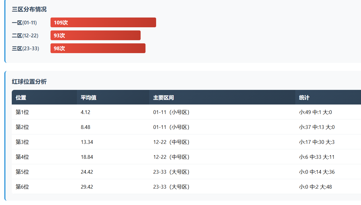 再看红球的区域分布,一区(01-11)明显偏热,累计出现次数领先,说明小号段始终保持活跃;二区(12-22)略显收缩,属于中段调整区;三区(23-33)则相对均衡,没有明显偏移。这种结构下,小号开头、中段承接、大号收尾的节奏依然清晰。