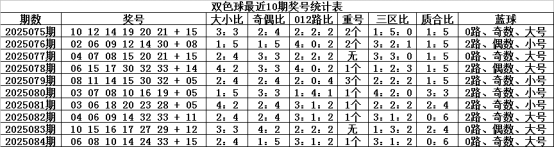 双色球第2025084期开出奖号为:06、08、10、14、24、33+15,其中红球号码奇偶比为1:5,大小比为2:4,012路比为3:1:2,和值为95,跨度为27,三区比为3:1:2,开出1个重复红球:10。蓝球开出奇数、大号、0路。