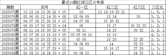 一区上期走热,开出3个红球,近10期开出23个红球,表现非常活跃,本期预计走温,开出1-2个红球,参考号码01、11;二区上期走温,开出1个红球,近10期共开出23个红球,出号比例相对较高,本期预计走温,开出1-2个红球,注意号码12、14;三区上期走温,开出2个红球,近10期共开出14个红球,走势相对较冷,本期预计继续温冷,看好号码25、28;
