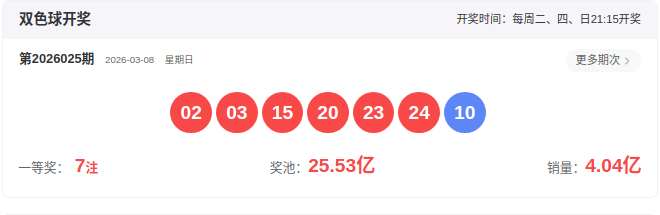 2026025开奖号码: