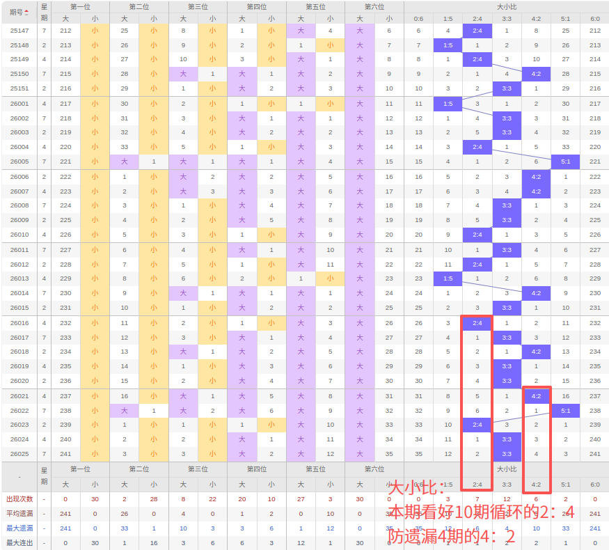 上期大小比:3:3,近10期大小比出现情况:2:4、3:3、4:2、3:3、3:3、4:2、5:1、2:4、3:3、3:3,最近10期出现5期3:3,出现2期4:2,出2期2:4,出现1期5:1,出现0期1:5,出现0期6:0,出现0期0:6,根据近10期规律本期看好10期循环的2:4,防遗漏4期开出4:2,综上所述推荐大小比推荐:4:2,重点关注:2:4。