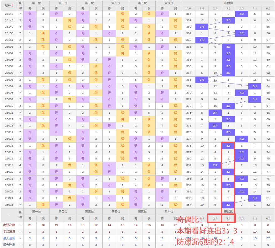 上期奇偶比:3:3,近10期奇偶比出现情况:3:3、4:2、4:2、2:4、3:3、4:2、3:3、4:2、5:1、3:3,最近10期出现4期3:3,出现4期4:2,出现1期2:4,出现1期5:1,出现0期1:5,出现0期6:0,出现0期0:6,根据近10期规律本期看好连出3:3,防遗漏6期出2:4,综上所述推荐奇偶比推荐:2:4,重点关注:3:3。