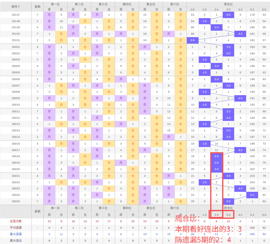 上期质合比:3:3,近10期质合比出现情况:1:5、4:2、2:4、2:4、2:4、3:3、1:5、4:2、5:1、3:3,最近10期出2期3:3,出现2期4:2,出现3期2:4,出现1期5:1,出现2期1:5,出现0期6:0,出现0期0:6,根据近10期规律本期连出3:3,防遗漏5期出的2:4,综上所述推荐质合比推荐:2:4,重点关注:3:3。