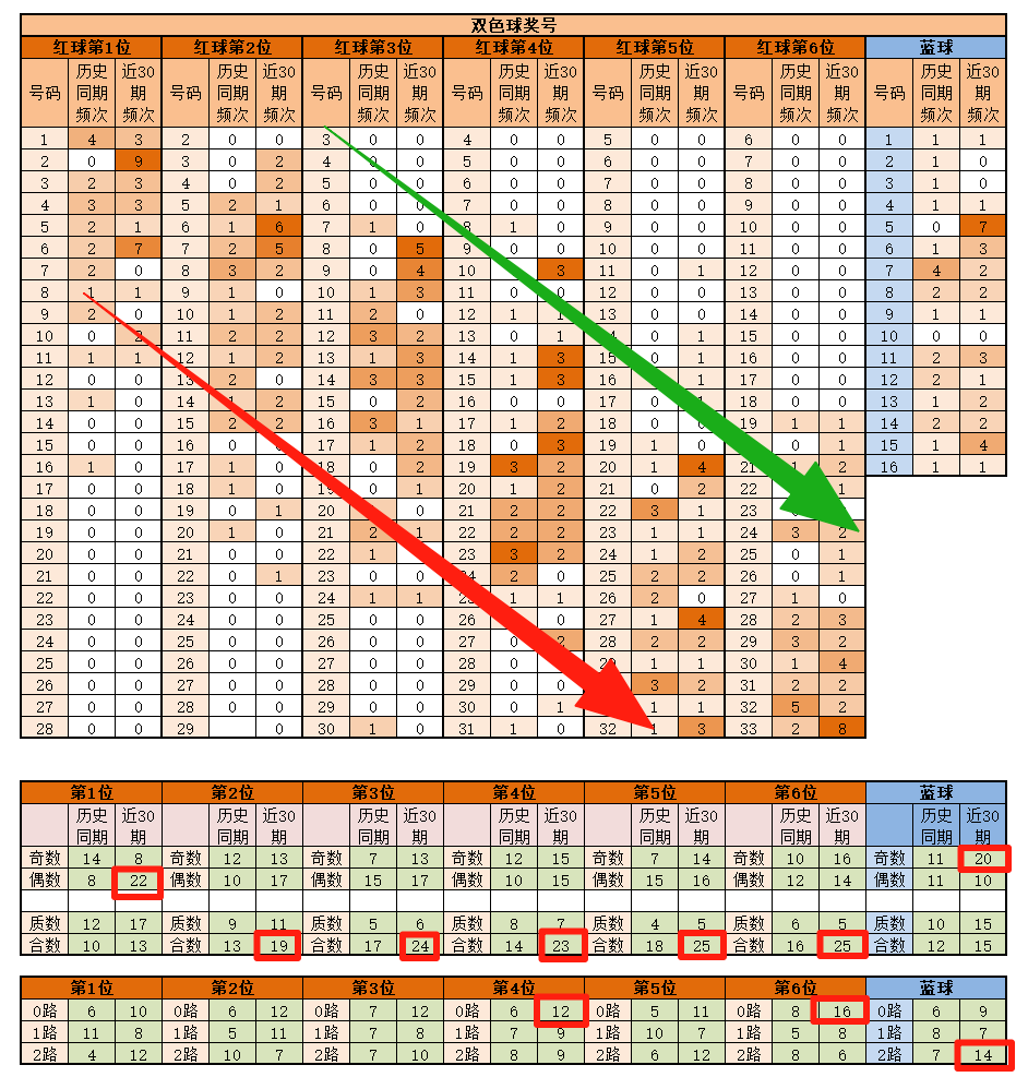 第6位,基本在21-33之间,历史同期频次最多的为32;近30期,频次最多的为33,明显特征是合数和0路优势;推荐重点28-30-33。