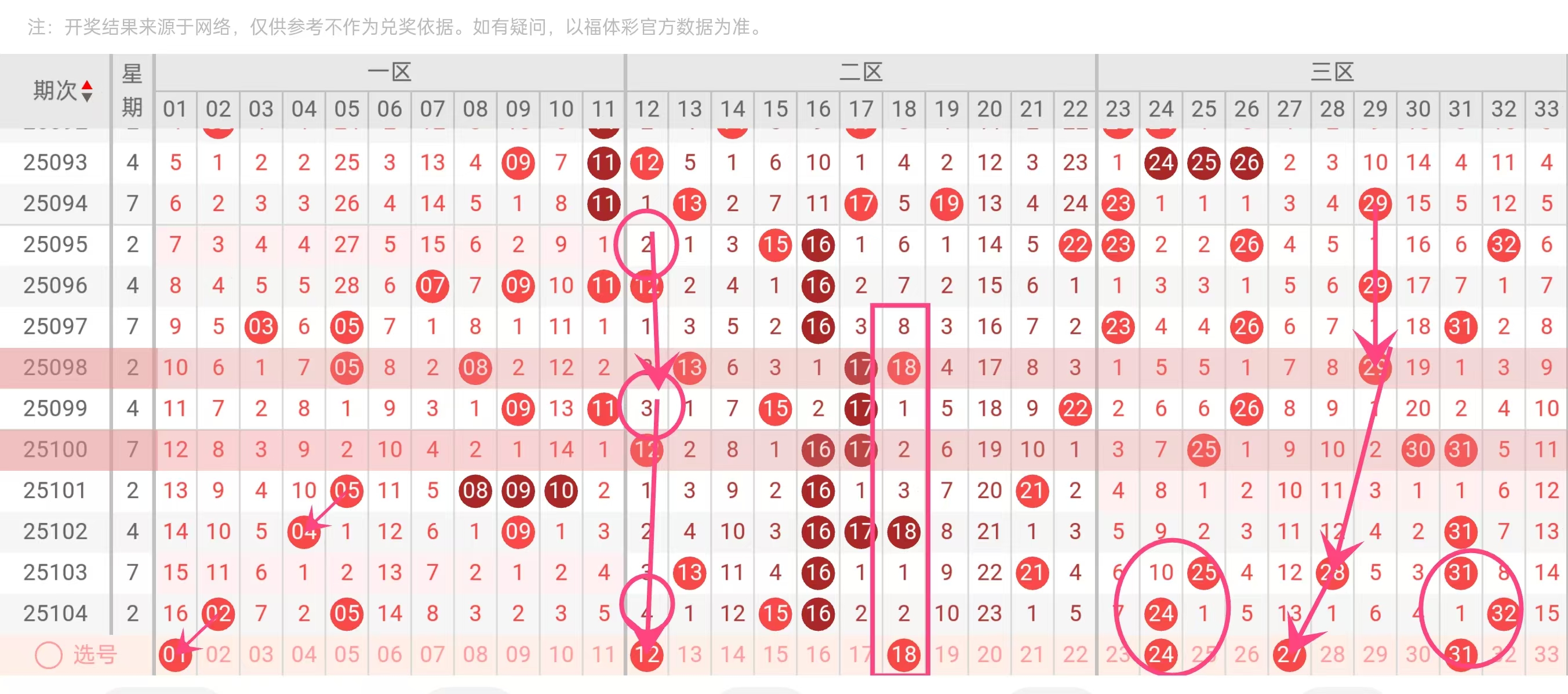 区间分布:一区2个(01,12)、二区1个(18)、三区3个(24,27,31) 2:1:3的分布符合近期三区活跃的趋势