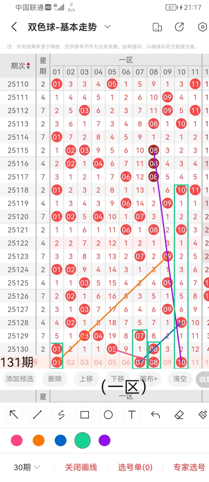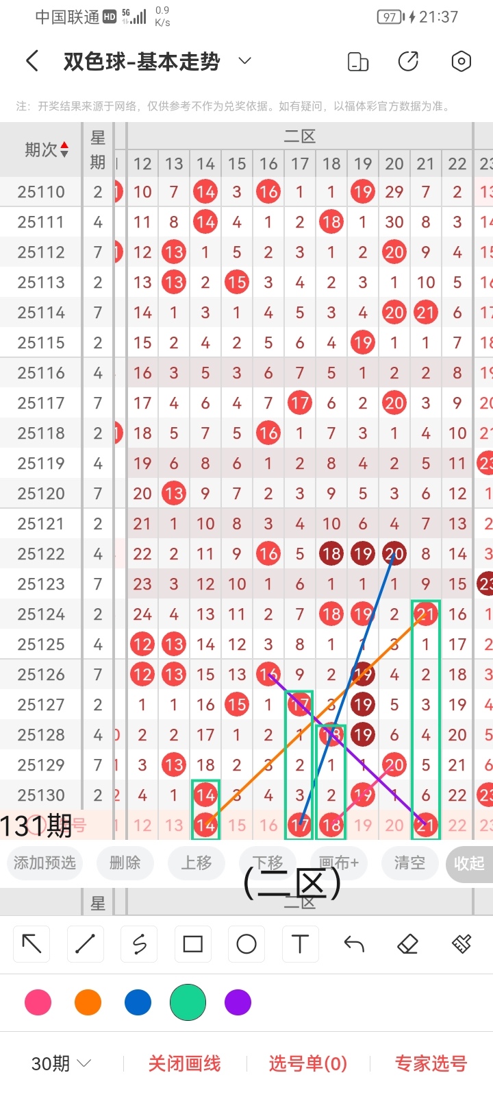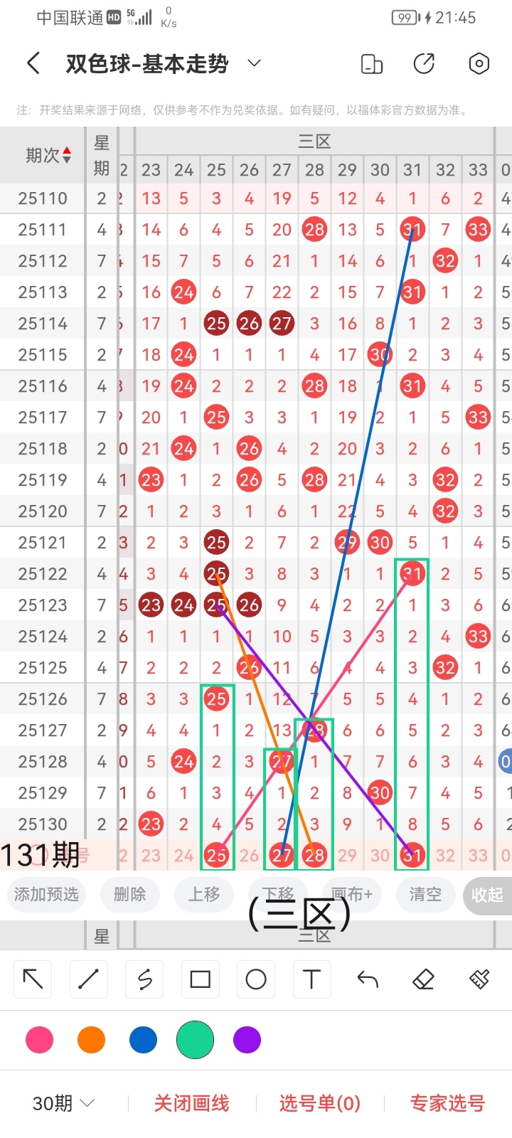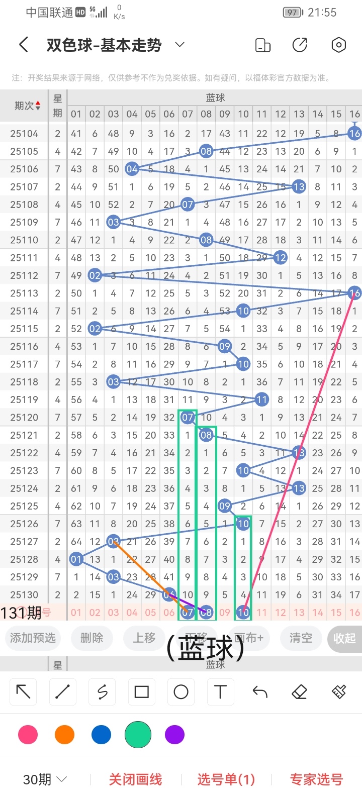小梁根据图中画线思路,最后给大家汇总提供一下本期红球、蓝球数据,供大家参考:
