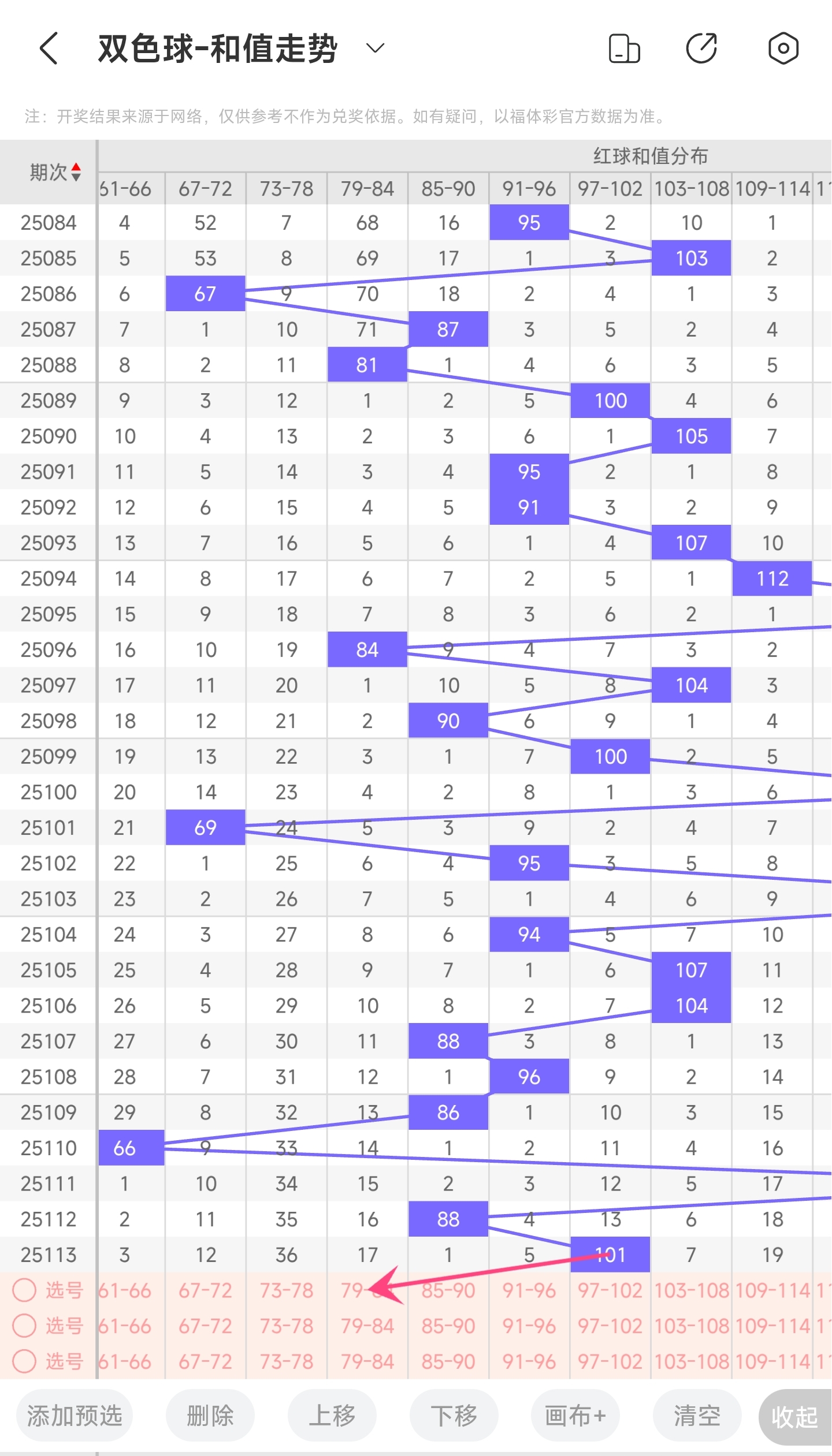 上期和值为101,而近5期和值为86,66,133,88,101均值95.2,上期和值较前一期增加了13,振幅为13。101和值是属于近30期内开出的比较大的和值,继续上升的的空间比较小,下降的空间比较大。所以推测本期和值趋势是大概率会往左下降,和值变小,小概率继续往右,和值变大。
