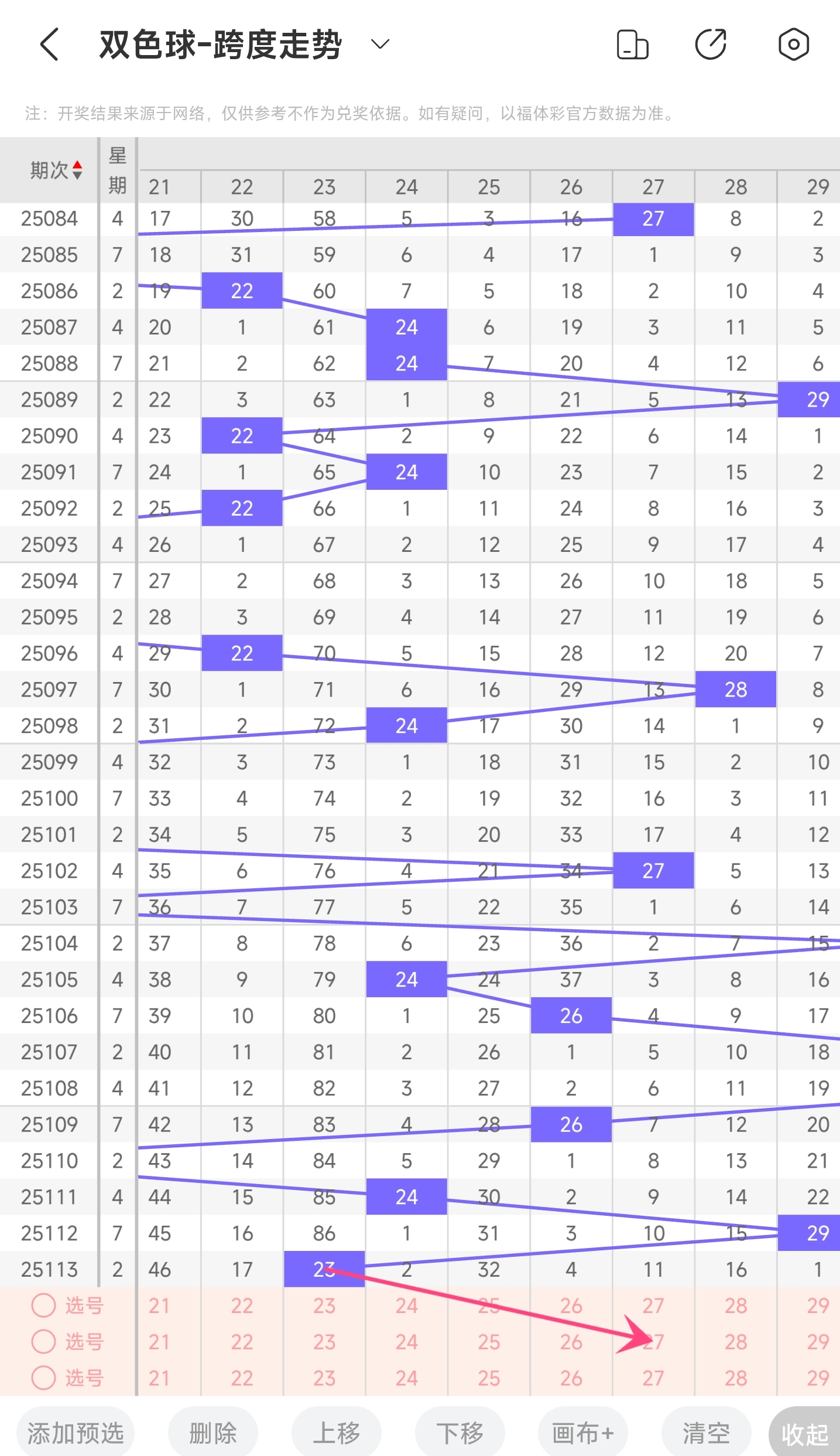 上期龙头为08,凤尾为31,跨度为23,往前一期跨度是29,偏移量为6。23跨度值是30期内开出的比较中间的跨度值。上升的空间和下降的空间差不多,因为上期龙头较大,本期龙头有可能往左开变小。所以推测本期跨度有可能是跨度会变大,趋势往右,小概率往左,跨度变小。