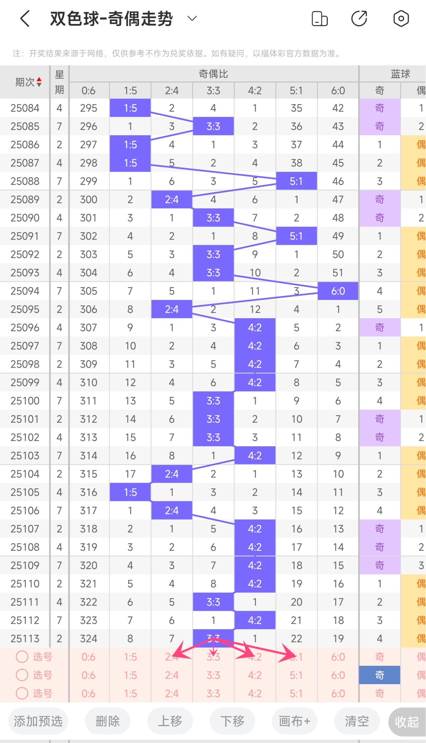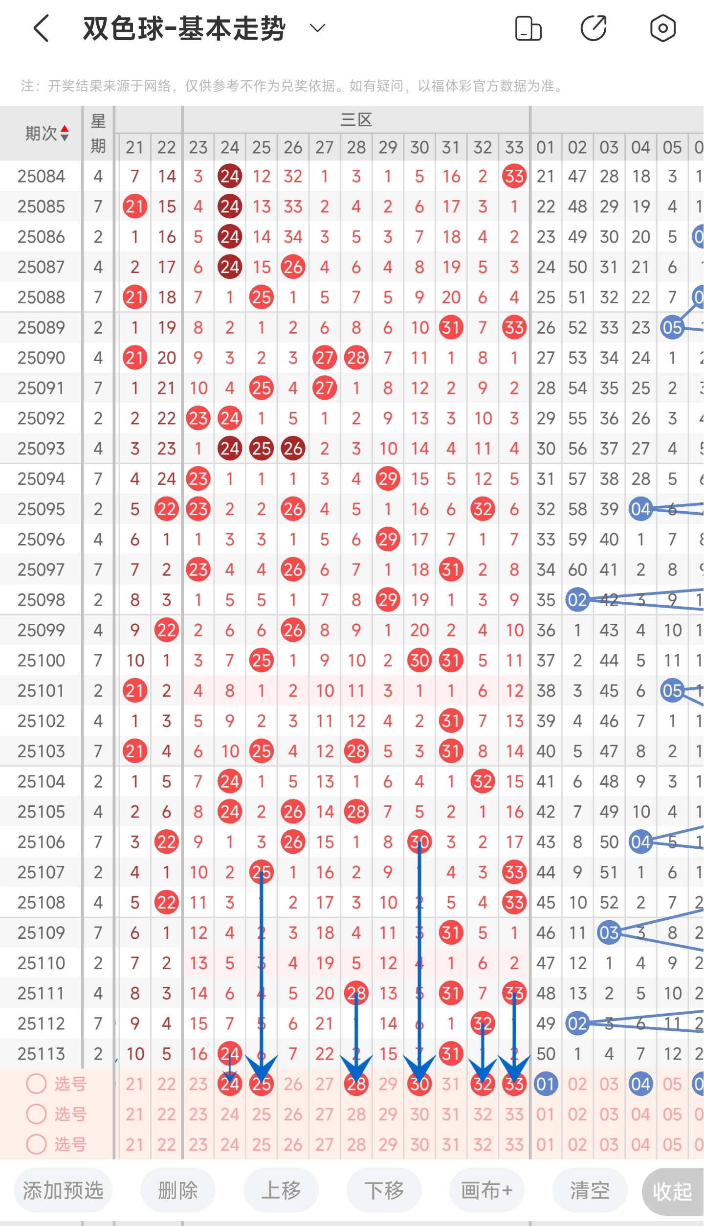 上一期三区开出了24和31号球。往前一期开出32号球。通过走势图分析,可以看到凤尾的话还是一如既往的开在右边,所以本期右边的号码我们还是要主要关注,而左边的号码已经连续空了比较多的期数,也要考虑回补的可能。再结合冷热号和遗漏期数,本期我们可以关注24,25,28,30,32,33等号。综上所述本期我们推测有可能开出24,25,28,30,32,33等号码。