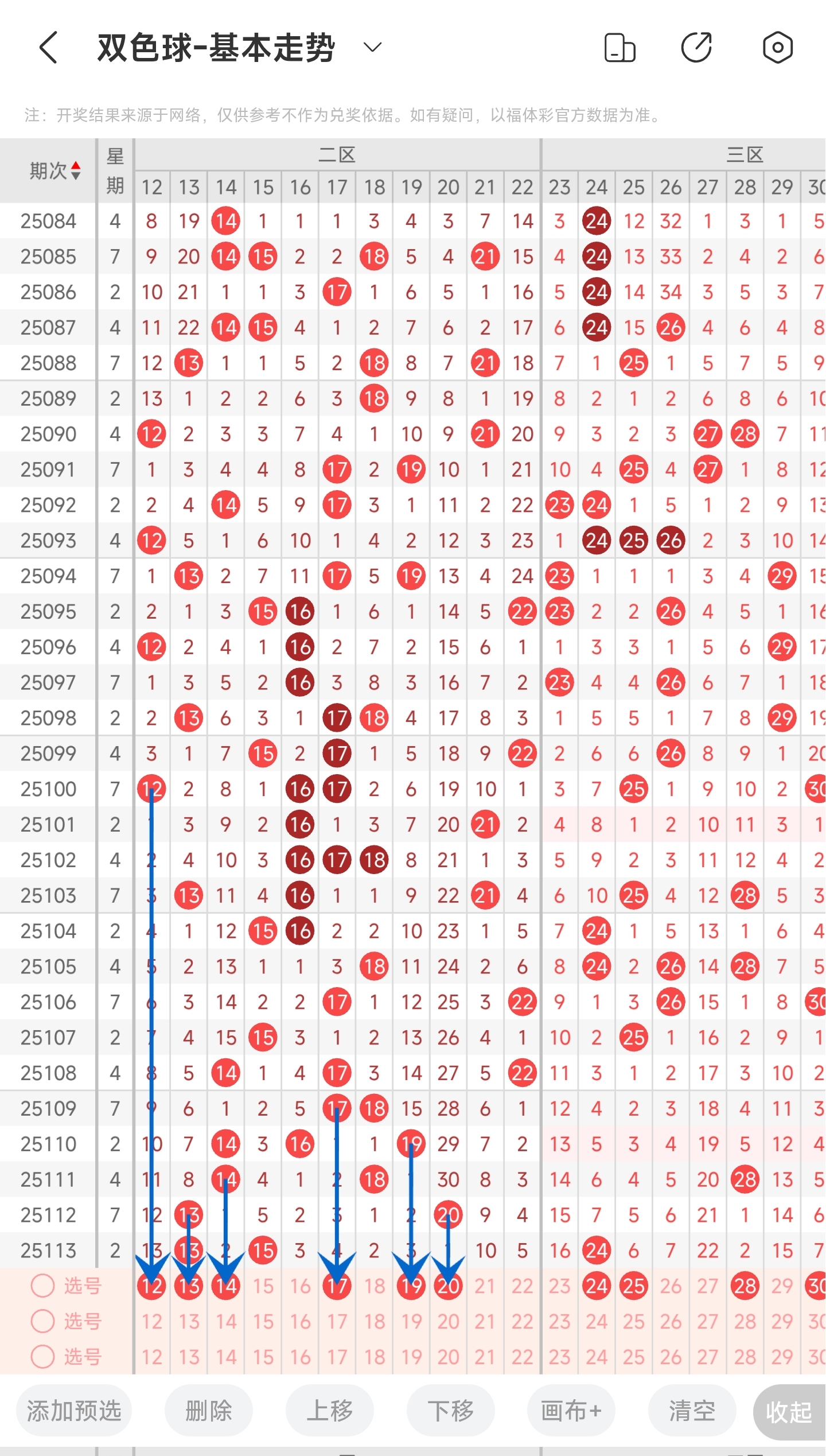 上一期二区开出了13,15等号码。往前一期开出了13,20。通过分析走势图,整体来看,最近开出的号码开在二区左边的号码比较多,然后就是中间和中间往右一点的号码。所以本期我们还是主要关注左边的号码,其次是中间和中间偏右一点的号码。最后结合冷热号和遗漏期数,本期我们可以关注一下12,13,14,17,19,20等号码。综上所述推测本期可能开12,13,14,17,19,20等号码。