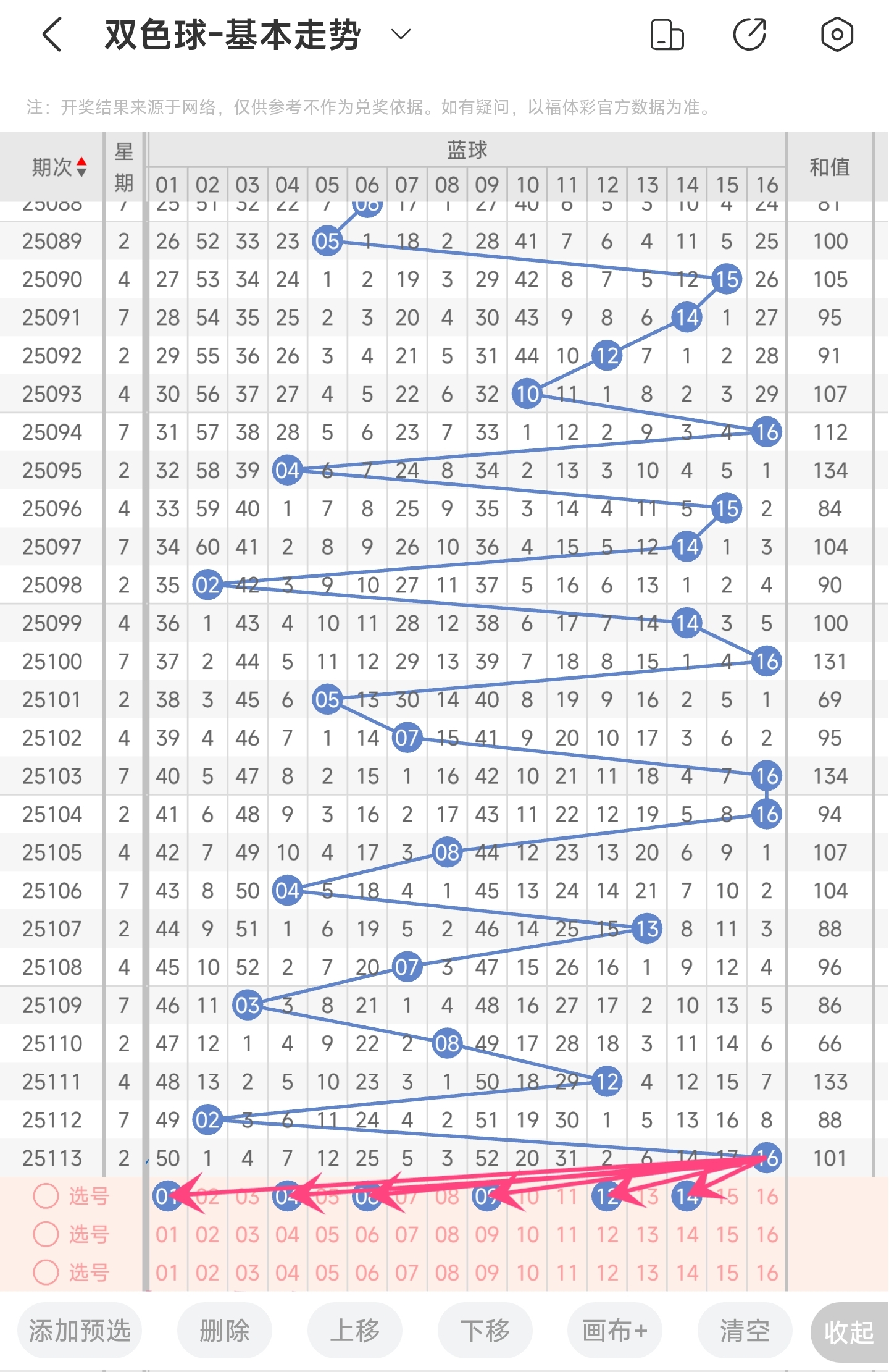 上期开出的是16,往前一期开出的是02。趋势往右偏移,偏移量为14。通过分析目前蓝球的走势图,可以看到最近两期的走势都比较陡,偏移量都很大,所以本期有可能会继续比较陡,但也要考虑放缓的可能性,因此本期我们大中小偏移量的号码都要关注一下。再结合遗漏期数,以及冷热号,本期我们可以关注01,04,06,09,12,14等号码。综上所述本期推测可能开出01,04,06,09,12,14等号码。