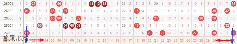 如图所示:首尾制约平衡组范围依次为:拉推缩,拉拉? 本期形态范围优先选择红色压缩首尾。由于上期号码已经进入新走势第1期,目前处在新走势第2期,利用常规起号形成压缩还是均定就是走势正反方向。