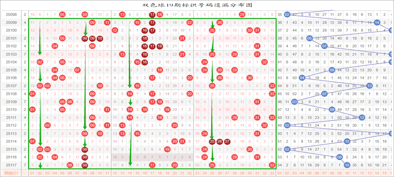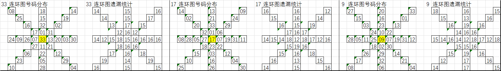由于数据量大,不一一统计,下图为各个号码分别在33、17、9连环图上的遗漏统计汇总图: