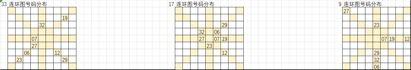以上是33、17、9的连环图,可以在一起彩平台的九转连环图中查看历期号码分布,以当前期数来看,历史同期共有19期(2003-2023),那么我们就以19期号码来进行遗漏统计,然后把每个号码在近19期的遗漏总数统计出来,分别带入33、17、9的连环图,取出遗漏值大于16的号码,把这些号码在“环上”和“轴上”的相邻号码取出来进行统计,选取出次前15的号码作为大底。