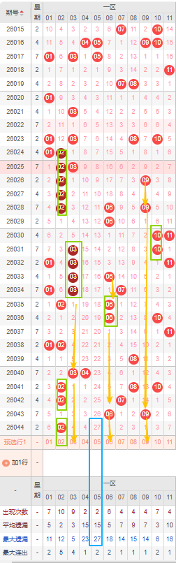 一区本期选号建议首先考虑遗漏期数较大的号,05号都达到了遗漏十期以上且已到达其最大遗漏期数,是目前一区遗漏期数最大的号建议防冷号开出。隔断号可以考虑09号,本期若开出将形成1-14-1的形态规律,还有06号若开出则形成1-7-1的形态。
