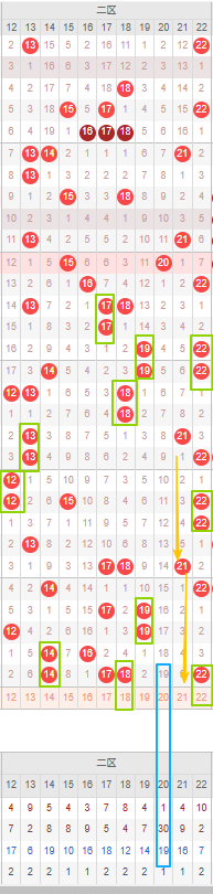 由图可见红球二区目前遗漏达十期以上的冷号可以考虑20号,都遗漏十期以上且达到了最大遗漏期数,可以防冷号开出。可见二区的冷号也只遗漏十余期左右而已,那么因此本期考虑的重点就是重号以及邻号开出。二区来着重看隔断号首先可以考虑21号,若本期开出将形成5-5的形态规律,同时可以本期考虑作为邻号开出。