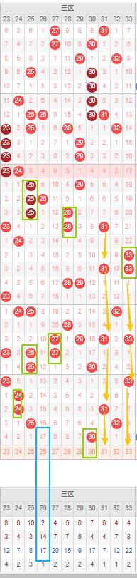 在近20期内开出了重号次数较多,还有连续开出了三重号及以上,但是可见近二十期多重号的概率减少了不少,那么本期可以防30号继续开出重号。26号遗漏期数已经有10期以上,且已经达到其本身的最大遗漏期数,而且是三期遗漏最大的可以考虑防冷号开出。三区本期只有一位冷号而且期数不太高,那么本期主要看隔断号,31号若开出则形成2-4-4--2的形态,33号若开出形成4-2-4的形态。