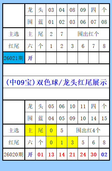 26020期开奖红球01、13、14、21、24、30,蓝球02。大小比3:3,奇偶比3:3,三路比3:2:1,和值103。