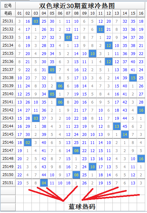 蓝球本期有热蓝8枚,冷蓝8枚,蓝球热码数量一样。上期开出冷蓝,近期蓝球冷热交替开出规律明显,本期蓝球热码可能性大。
