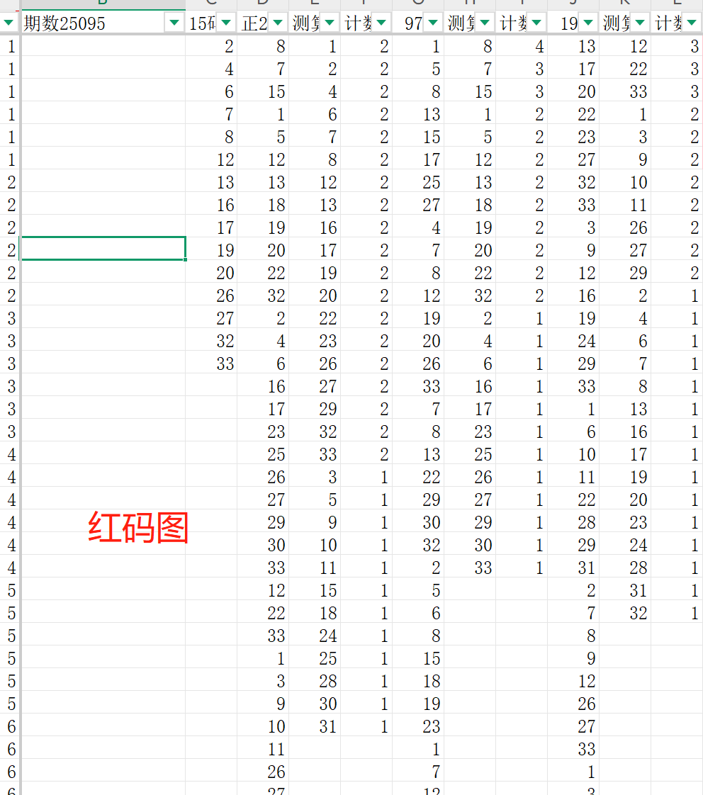 得出一组红码数据就是:2 4 6 7 8 12 13 16 17 19 20 26 27 32 33