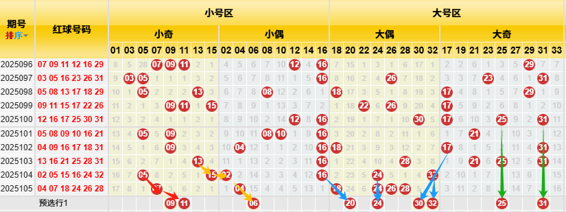 1、小大奇偶交叉图(小奇数红色箭标、小偶数黄色箭标、大偶数蓝色箭标、大奇数绿色箭标)