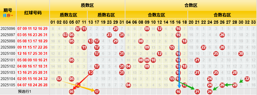 根据近十期质合数据统计:质数左区出现10次(上升),质数右区出现13次(下降),合数左区出现23次(持平),合数右区出现14次(持平),总体质数出现23次(持平),合数出现37次(持平),由于33个红球质数12个、合数21个,占比4:7, 根据近十次质合比重1:2来看, 从比重比例对比近十次数据发现,质数略低于合数,因此本期预计合数右区上升。本期根据斜率遗漏对称理论,质数左区需注意防05,质数右区17;合数左区需注意防16,合数右区需注意防21 24。