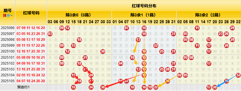 【数据参数】 根据前区除3余数,组合成上图分别为余0路(简称0路)3、6、9、12、15、18、21、24、27、30、33;余1路(简称1路)1、4、7、10、13、16、19、22、25、28、31; 余2路(简称2路)2、5、8、11、14、17、20、23、26、29、32。