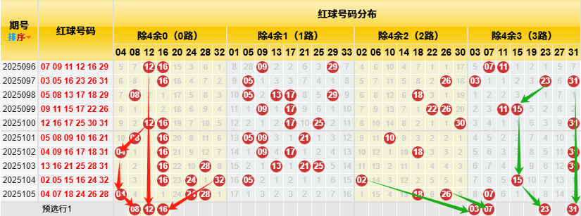 【数据参数】根据前区除4余数,组合成上图分别为余0路(简称0路)4、8、12、16、20、24、28、32);余1路(简称1路)1、5、9、13、17、21、25、29、33;余2路(简称2路)2、6、10、14、18、22、26、30;余3路(简称3路)3、7、11、15、19、23、27、31。