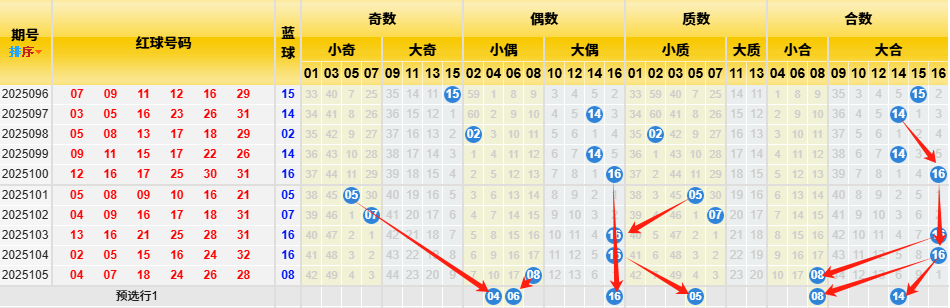 根据蓝球近十期数据统计:小奇数出现2次,大奇数出现1次,小偶数出现2次,大偶数出现5次,小质数出现3次,大质数出现0次,小合数出现1次,大合数出现6次。从上述数据可以看出看出小质数、大合数处于极热状态正在转冷,本期关注偶数;再来看历史数据统计,小奇数出现848次,大奇数出现850次,小偶数出现802次,大偶数出现750次,小质数出现816次,大质数出现412次,小合数出现607次,大合数出现888次,从上述数据可以看出小奇数、大偶数、小质数、小合数历史数据占优,结合近十期数据对比,因此短期内关注合数和奇数持续大热,故本期结合上述数据并根据斜率对称原理看好04 06 16 05 08 14