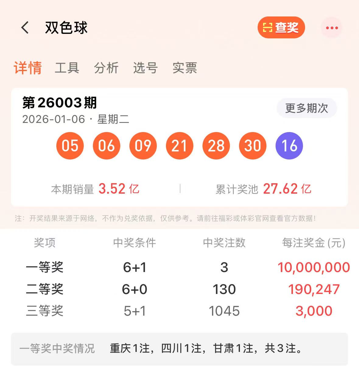 上期双色球开奖结果为 05.06.09.21.28.30+16
