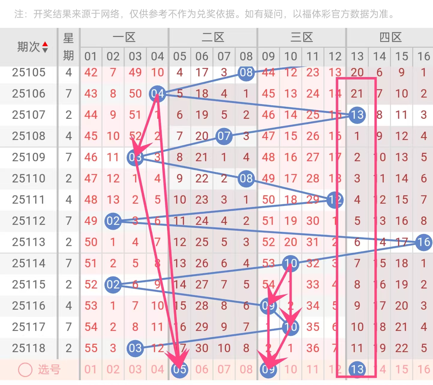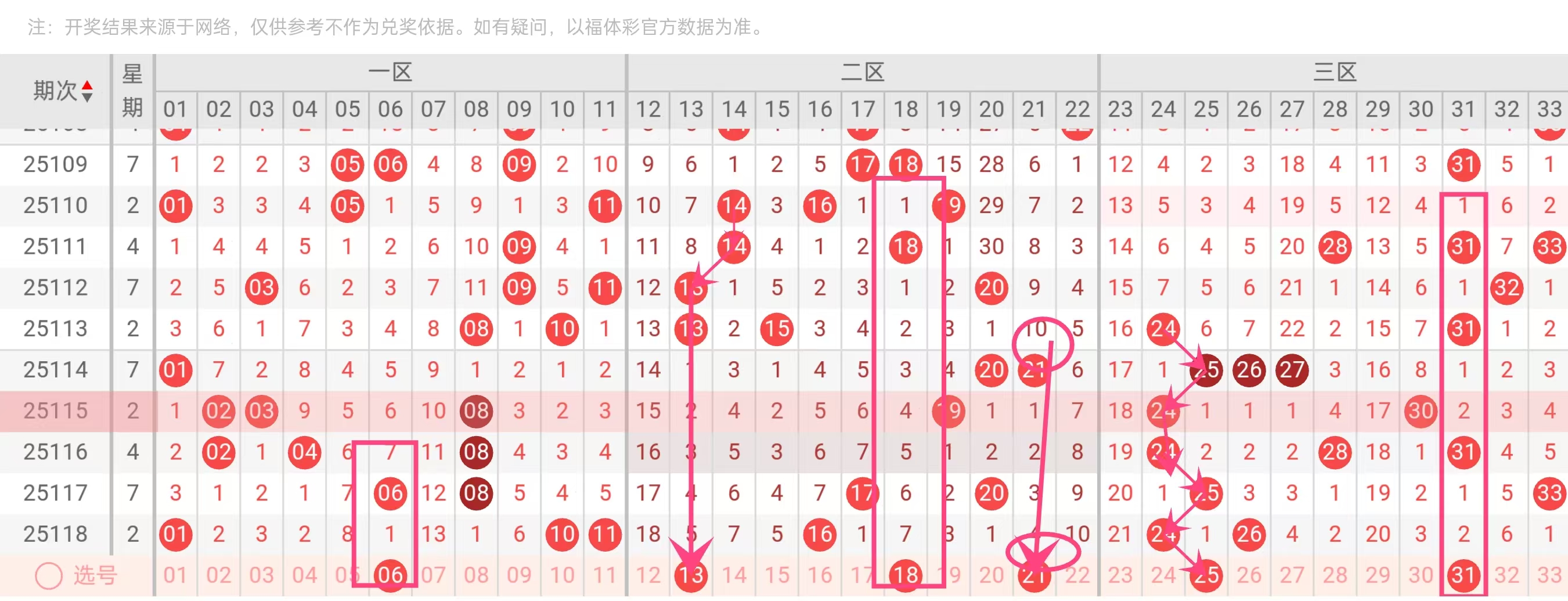 31号:后区大数号码31正处于价值回归阶段。该号码在经历充分冷却后,技术指标显示其已接近爆发临界点。与最大号33相比,31号具有更好的位置优势和组合潜力。从区域轮动角度看,31号有望成为下一阶段后区的新热点。