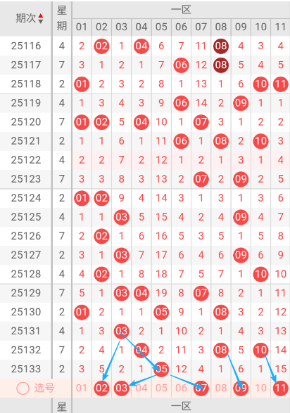 根据走势图可以看出当区段,123期开出07.09二个号码球 ,124期开出01.02二个号码球 ,125期开出03.09二个号码球 ,126期开出02一个号码球 ,127期开出03.09二个号码球 ,128期开出02.10二个号码球 ,129期开出03.04.07三个号码球 ,130期开出01.05.08三个号码球 ,132期开出04.08.10三个号码球 ,133期开出05一个号码球 ,按照如此规律本期当前区判断可能会开出1双1单。我们看下当前区上期没有开出重叠号,那么本期当前区要定重叠号的情况下可关注05号码球。再看下当前区段上期开出05斜连号,当期选号得留意06斜连号。建议重点关注02.03.07.09.11