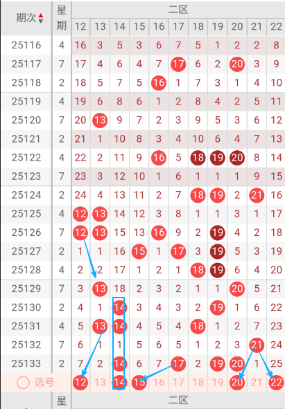 根据走势图可以看出当前区段,123期没有开出号码球 ,124期开出个18.19.21三号码球 ,125期开出12.13二个号码球 ,126期开出12.13.16.19四个号码球 ,127期开出15.17.19三个号码球 ,128期开出18.19二个号码球 ,129期开出13.20二个号码球 ,130期开出14.19二个号码球 ,132期开出21一个号码球 ,133期开出14.17.19.20四个号码球 ,按照如此规律本期当前区可能开出1双或1双1单。我们看下当前区上期没有开出重叠号,那么本期当前区要定重叠号的情况下可关注20号码球。再看下当前区上期没有开出斜连号,当期选号得留意斜连15号码球。本区重点关注12.14.15.20.22