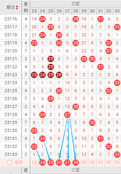 根据走势图可以看出当前区,123期开出23.24.25.26四个号码球 ,124期开出33一个号码球 ,125期开出26.32二个号码球 ,126期开出25一个号码球 ,127期开出28一个号码球 ,128期开出24.27二个号码球 ,129期开出30一个号码球 ,130期开出23一个号码球 ,132期开出23.32二个号码球 ,133期开出33一个号码球 ,按照如此规律判断本期当前区可能开出1双或2双。我们看下当前区上期没有开出重叠号,那么本期当前区要定重叠号的情况下可关注33码球。再看下当前区上期开出33斜连号,当期选号得留意32斜连号。本区重点关注24.25.26.27.28