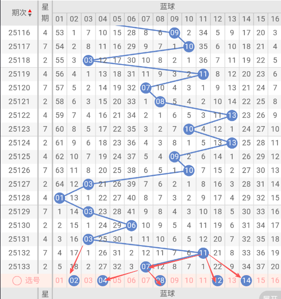 根据走势图近10期的走势看,蓝球在126期开出10蓝球之后,5小1大1小,再看下近10期的蓝球中冷码有回补的趋势,这种趋势规律本期判断极有可能开出双号,本期防蓝球10大号,蓝球本期重点关注02,04,08,12,14