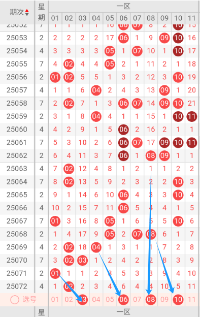 根据走势图可以看出当区段,064期开出了02.10二个号码球,065期开出了06.10二个号码球,066期开出06一个号码球,067期开出了01.05.10三个号码球,068期开出05.07.08三个号码球,069期开出02.04二个号码球,070期开出02.03二个号码球,071期开出了01一个号码球,072期开出了02一个号码球,按照如此规律本期当前区可能会开出1双1单。我们看下当前区上期没有开出重叠号,那么本期当前区要定重叠号的情况下可关注02号码球。再看下当前区段上期开出02斜连号,当期选号得留意03斜连号。建议重点关注03.06.08