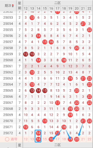 根据走势图可以看出当前区段,063期没有开出19.21.22三个号码球,064期开出了13.22二个号码球,065期开出了13.14.15.20四个号码球,066期开出了22一个号码球 ,067期开出了17.20.22三个号码球,068期开出了19.20二个号码球,069期开出了19一个号码球,070期开出了15.21.22三个号码球,071期开出了12.18二个号码球,072期没有开出14.17二个号码球,按照如此规律本期当前区可能开出1单1双。我们看下当前区上期没有开出重叠号,那么本期当前区要定重叠号的情况下可关注14号码球。再看下当前区上期开出17斜连号,当期选号得留意斜连16号码球。本区重点关注14.16.19.20