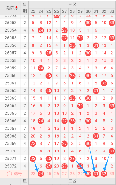 根据走势图可以看出当前区,063期开出了28.30二个号码球,064期开出来29.33二个号码球,065期没有开出号码球,066期开出了24.27.28.30四个号码球,067期没有开出号码球 ,068期开出了31一个号码球,069期开出了23.27.30三个号码球,070期开出了33一个号码球,071期开出了23.25.28三个号码球,072期开出了25.27.29三个号码球,按照如此规律判断本期当前区可能开出1单1双或2双。我们看下当前区上期开出25重叠号,那么本期当前区要定重叠号的情况下可关注27号码球。再看下当前区上期开出27.29斜连号,当期选号得留意24斜连号。本区重点关注24.30.31.32