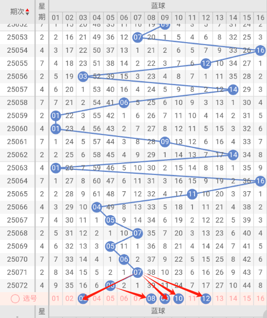 根据走势图近10期的走势看,蓝球在057期开出14蓝球之后,3小2大1小2大7小,再看下近10期的蓝球冷码有回补的趋势,这种趋势规律本期判断极有可能开出冷码大号,本期防蓝球03小号,蓝球本期重点关注08,09,10,12