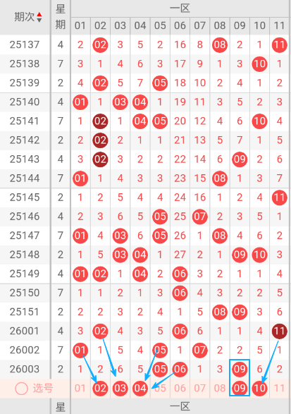 根据走势图可以看出当区段,144期开出01.08二个号码球 ,145期开出11一个号码球 ,146期开出05.07二个号码球 ,147期开出01.03.05.08四个号码球 ,148期开出03.04.09.10四个号码球 ,149期开出01.02.04.06四个号码球 ,150期开出06一个号码球 ,001期开出02.06.11三个号码球 ,002期开出01.05.07三个号码球 ,003期开出05.06.09三个号码球 ,按照如此规律本期当前区判断可能会开出2单。我们看下当前区上期开出05重叠号,那么本期当前区要定重叠号的情况下可关注09号码球。再看下当前区段上期开出06斜连号,当期选号得留意10斜连号。建议重点关注02.03.04.09.10