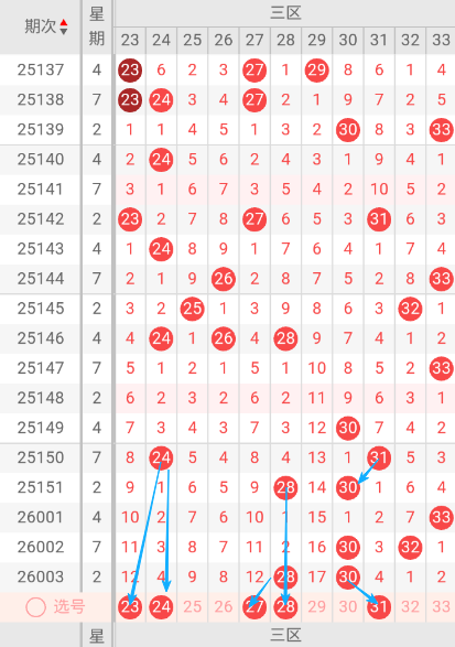 根据走势图可以看出当前区,144期开出26.33二个号码球 ,145期开出25.32二个号码球 ,146期开出24.26.28三个号码球 ,147期开出33一个号码球 ,148期没有开出号码球 ,149期开出30一个号码球 ,150期开出24.31二个号码球 ,001期开出33一个号码球 ,002期开出30.32二个号码球 ,003期开出28.30二个号码球 ,按照如此规律判断本期当前区可能开出1单或2单。我们看下当前区上期开出30重叠号,那么本期当前区要定重叠号的情况下可关注28码球。再看下当前区上期没有开出斜连号,当期选号得留意31斜连号。本区重点关注23.24.27.28.31