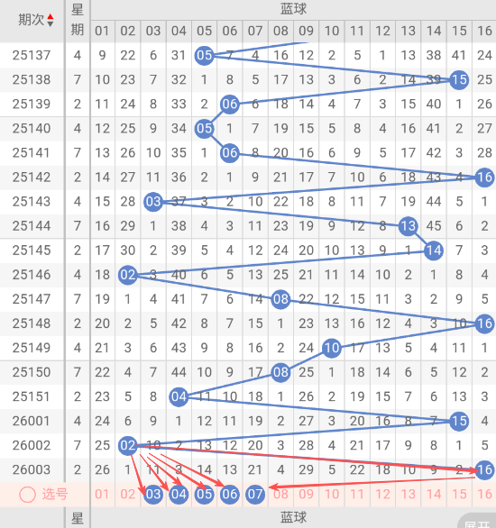 根据走势图近10期的走势看,蓝球在151期开出04蓝球之后,1大1小1大,再看下近10期的蓝球热码有回补的趋势,这种趋势规律本期判断极有可能开出小号,本期防蓝球13大号,蓝球本期重点关注03,04,05,06,07