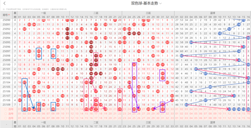 上一期三区开出了1个号码;本期三区仍可能会有号码开出,不看好断三区的情形,本期三区出号数量看好1-2个;本期三区需要关注的号码:25容易在遗漏值2或3时出号;26与24-25形成了斜连走势;29与31-33形成了斜连走势;28-29可能会一起落号;31可能会重出;因此本期三区选号应该考虑25-26-28-29-31等号码。