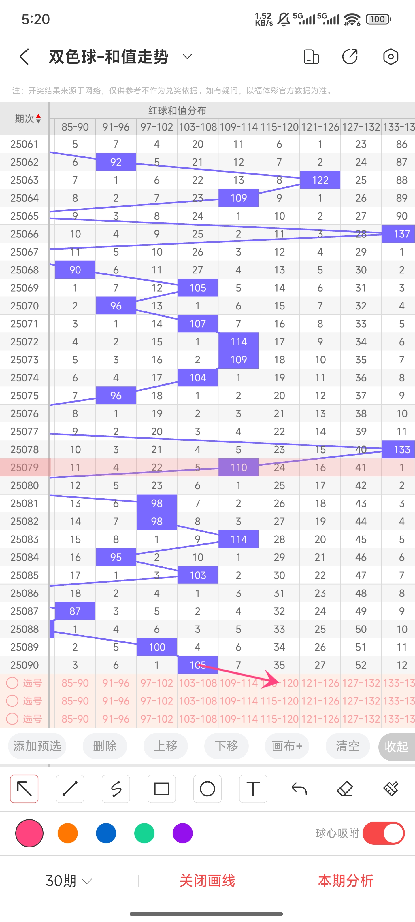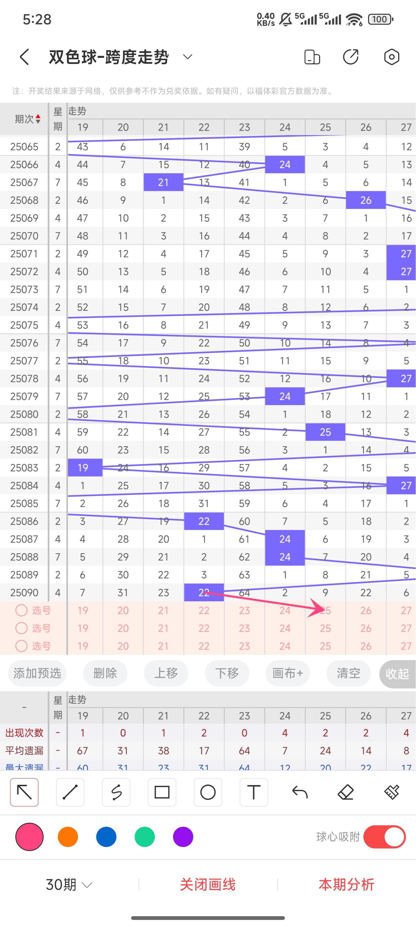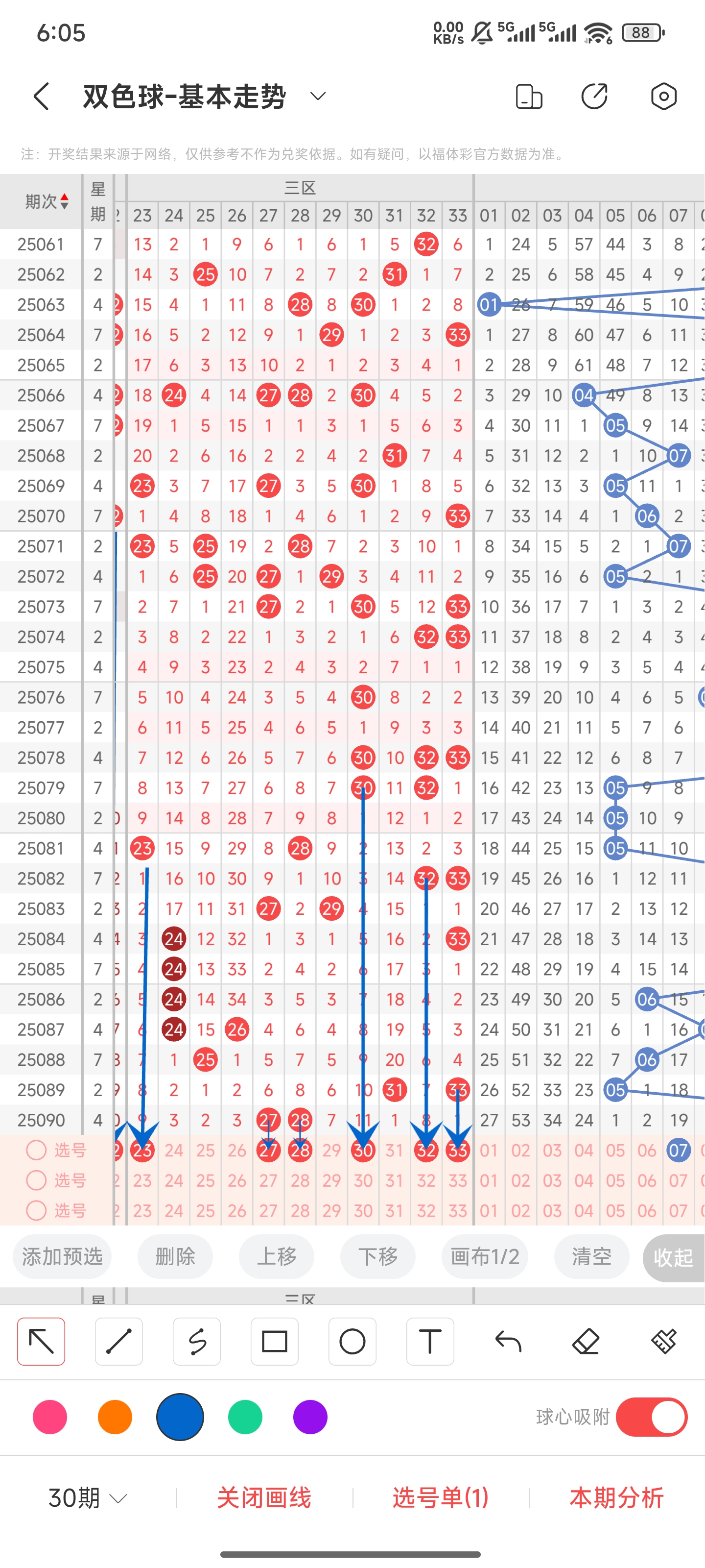 上一期三区开出2728。往前一期开出的是31332728都是目前三区比较热门的号码,所以本期我们可以考虑连出。通过分析走势图,我们可以看出三区基本上开出的都是热码,偶尔有温码或者冷码回归。所以本期我们也是着重看热码,其次是温码和冷码。所以热码我们可以关注3033。温码和冷码我们可以关注2332。综上所述本期我们推测有可能开出232728303233等号码。