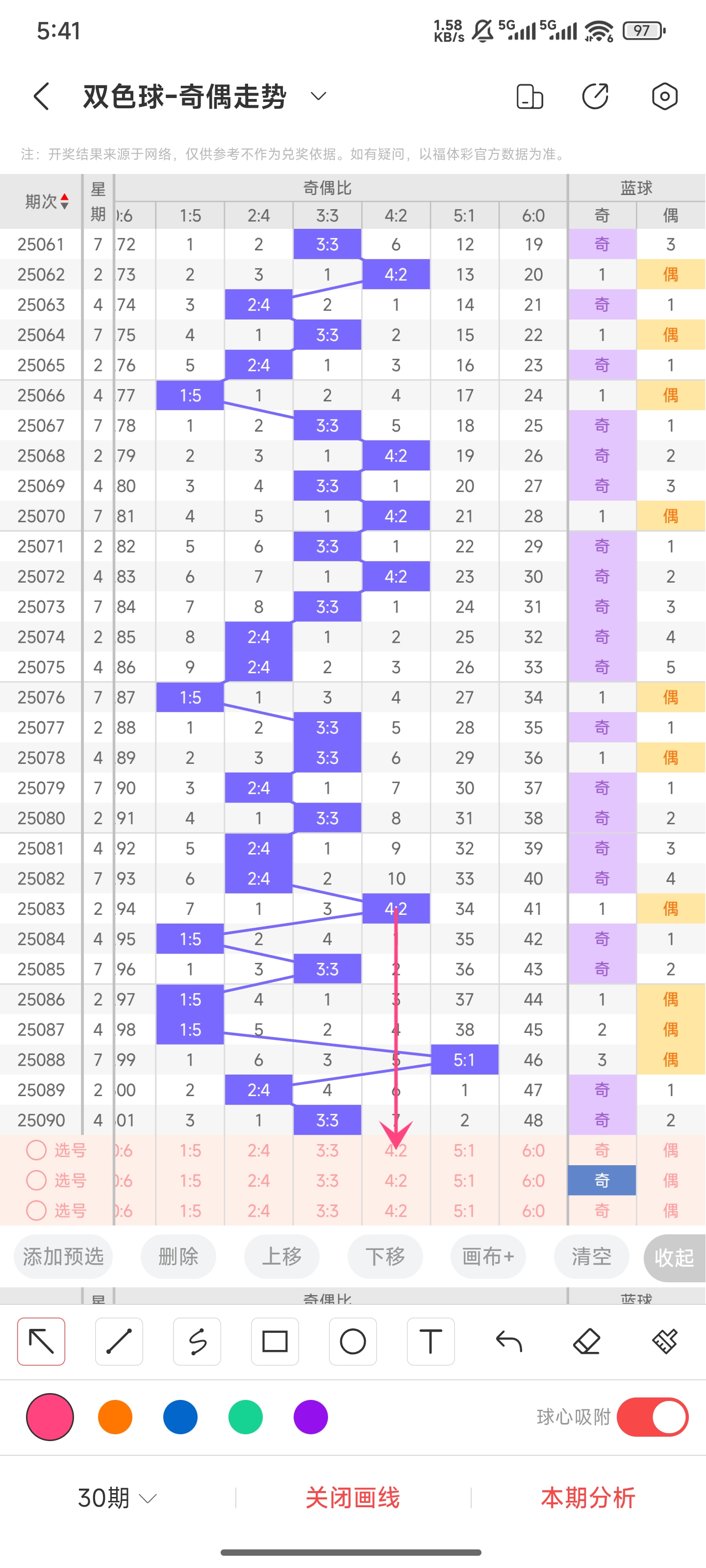 上期奇偶比为3:3,分别为偶奇偶奇奇偶。往前一期奇偶比为2:4。通过近30期内奇偶走势的数据分析,目前1:5奇偶比开出的概率是16.66%3:3奇偶比开出的概率是36.66%4:2奇偶比开出的概率是16.66%2:4奇偶比开出的概率是26.66%5:1奇偶比开出的概率是3.33%。其余类型为0%。与前一期相比1:5奇偶比的概率是下降了,3:3奇偶比是上升。通过走势图可以看到4:2奇偶比已经遗漏7期了,本期有可能会回归。所以推测本期有较大可能是开4:2奇偶比,小概率开2:4或者3:3奇偶比。