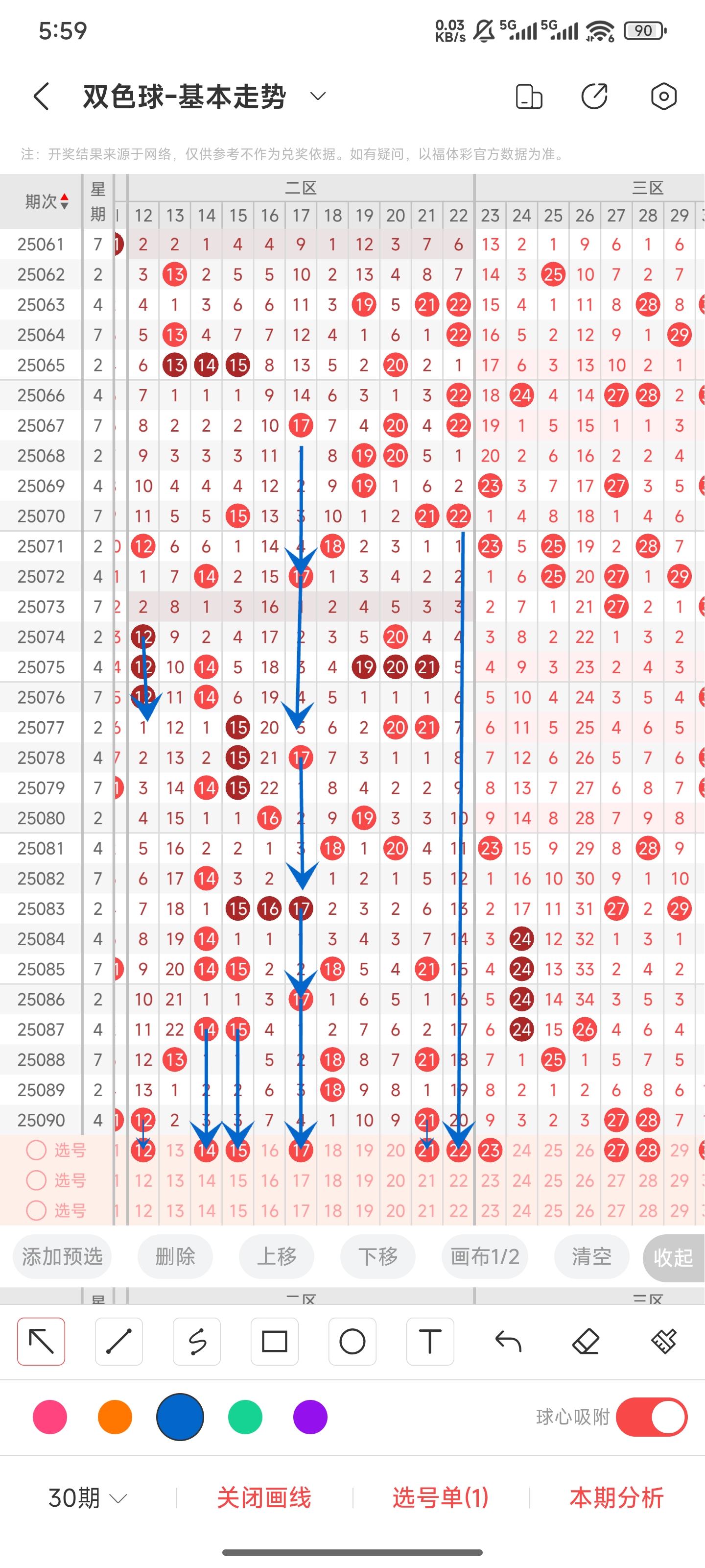 上一期二区开出为1221。往前一期开出了18。因为21号球是比较热门的号码,本期我们就可以考虑继续连出的可能性了。12号球近30期内有过3期连出的记录,所以本期也可以防一手连出。通过分析二区的走势图,从整体上看,开出的数字都是比较集中在左右两边的。所以左边的话我们可以关注一下1415,右边的话我们可以关注2122。除此之外,我们还要留意一下17号球,通过走势图我们可以看到基本上,每隔4或者5期,17号就会开出,而现在17已经遗漏4期了,有可能会被开出。所以综上所述推测本期可能开121415172122等号码。