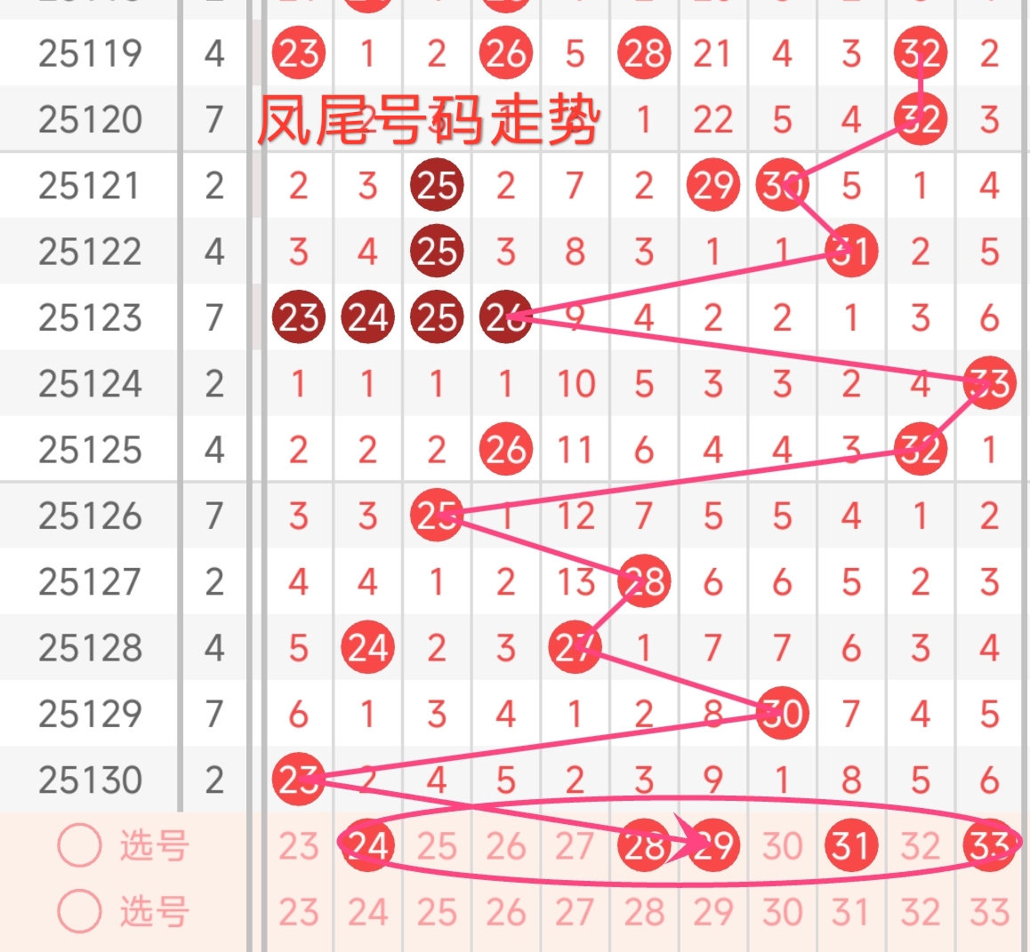 红球三区推荐(23~33): 上期开出1枚号码,号码为23,本期红三区建议出号1-3枚,本期红三区建议出关注号24、28、29、31、33。